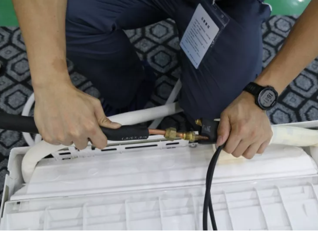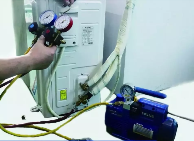 ![]() 空调内机、外机、连接管都安装完成后,采用新环保冷媒(R32或R410A)的空调必须按照要求二升真空泵抽取真空,严格按照说明书的时间执行。
