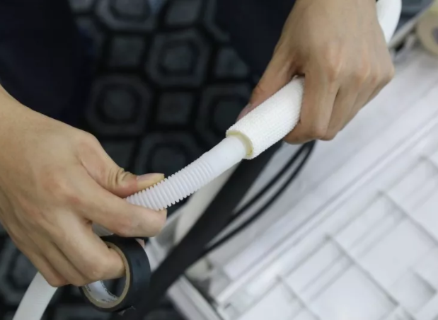 ![]() 内机与外机的连接铜管连接后,接着是将空调配有的包扎带,严密整齐地缠绕在连接管及排水管表面上,从而达到保温的效果。