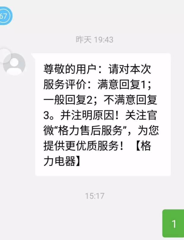 ![]() 服务完成后,告知用户,您将收到一条“格力电器”服务评价的短信。若您对安装服务满意,请回复数字“1”。您的满意是我们最大的动力。